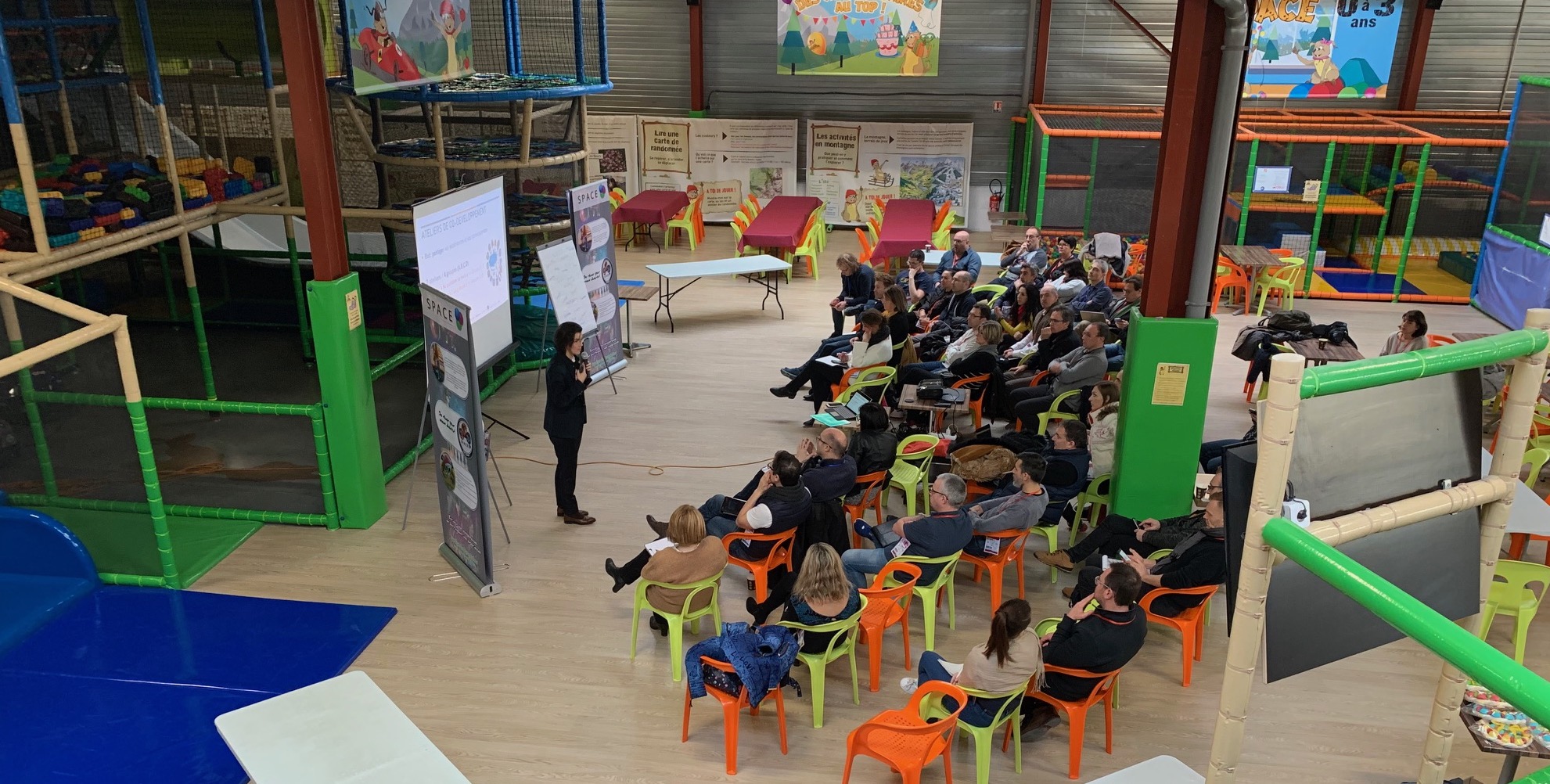 Sur place, vous disposez des tables et de 200 chaises, d’un vidéoprojecteur avec écran, d’une sonorisation avec micro et d’un accès Wi-Fi. Des jeux de café (baby-foot, air-hockey) peuvent aussi être ajoutés, en option, pour souffler entre deux sessions.